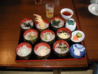 ここは老舗の蕎麦屋さんです。SATOが「宿場そば」が美味しそうだったので、ちょっと高いかと思ったのですが注文してしまいました。小さな椀が9つ並んでおり、それぞれに違ったトッピングがのっていて、9種類の味が楽しめました。
