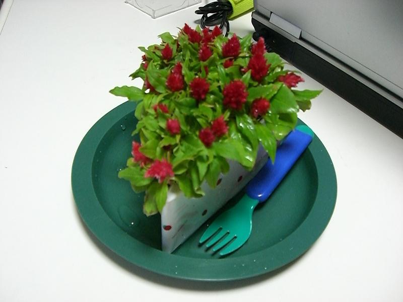 昨年の10月に幕張メッセで開催された、国際ガーデン&エクステリアEXPOで見つけた意匠登録出願中の容器にミ多粒蒔きしたニケイトウの『デリシャス ケーキ』が近くの花屋さんに4つありびっくり!生産元の有限会社 ゲブラナガトヨさんに問い合わせても完売で、あきらめていただけに見つけたときのうれしさは倍増!仙台の花屋さんかな〜?花物語さん、ありがとう! 合う受け皿がなくて色的に変だけどとりあえず間に合せ。
