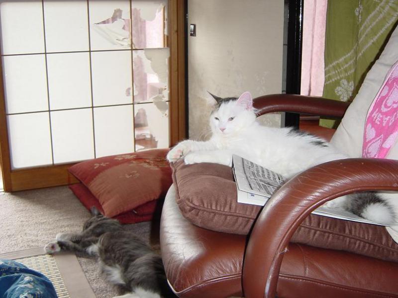 生後半年、我が家にやってきて3ヶ月であるが、こんなにも早く我が家が占領されてしまうとは・・・・よみが完全に甘かったようである。当初は、20畳あまりの部屋を全て提供(かなり譲歩したのだ)したのだから全く問題はないと思っていたのだが、私以外のご主人様が猫の立場云々を理由に少しずつ行動範囲を広げていったのがそもそもの間違いなのだ。確かに、2匹ともとても懐こくて可愛いが、家の中を全て占領されたのでは話が違う。カーテンはブランコ代わりにされてぼろぼろ、洗濯物したばかりの衣類はベット代わりで毛だらけ、そして障子窓は無残にも破られ埴生の宿状態なのである。でも、良く考えると猫たちには責任はない、勝手に猫の立場を利用して自分の思い通りの飼育をしている「陰のご主人様」が全て悪いのだ。といってもいまさら遅すぎるのだ。