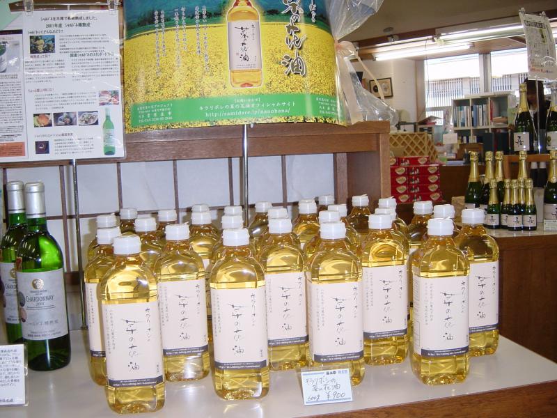 その中で、地域興しの一貫として、長井市と白鷹町の会員30名(生産者数33名)で「菜の花村 未来づくりの会」が発足され、約14.5haが作付けされた。そして、8月23日に搾られた一番搾り300本が、置賜地域地場産業センターに納入され同時に販売をスタートした。「キラリボシ」という種類の菜の花油で、深い透明感のある黄金色をしており、まさしく植物油の女王という感じなのである。年間総生産数が未だ3,000本と少なく、貴重価値の高い製品だけに、1本900円と少々割高ではあるが、「価格以上に満足していただけるはず」とのこと。