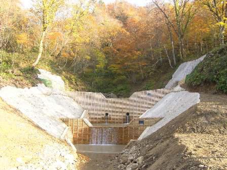 当現場は土石流の防止を目的とした構造物です。この沢では集中豪雨によって土砂が流出し、下流の道路及び農業用水路を閉塞させていました。