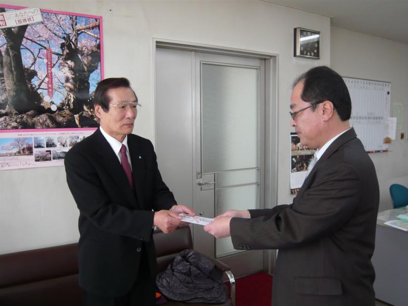 3月26日、当会平忠一会長が山形新聞社長井支局を訪問し、山新放送愛の事業団に49,500円を義援金として、支局長に手渡しました。