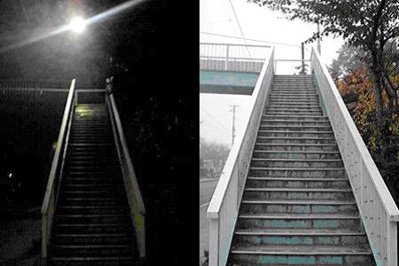 ひとつのものを見るときでも、まわりの状況が違うだけでぜんぜん違う雰囲気にみえることがよくある。この歩道橋もそのひとつだ。