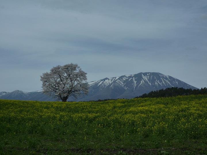 仕事の合間にちょっと立ち寄ったのが小岩井農場にある一本桜です。満開の桜の後ろに岩手山が見えます。この桜はNHK朝の連続ドラマ『どんと晴れ』の舞台となった桜です。とってもきれいです。