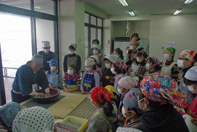 レンジ教室。冬の恒例事業そば打ち体験教室を行いました。 会場の広さや道具の数、安全に指導できる人数などを考慮し、10組限定 の募集でしたが、今年もたくさんの方にお申し込みをいただき、抽選の 結果、11組35名のみなさんに参加していただきました。 (落選になってしまったみなさん、申し訳ありませんでした。) ![]() まずは“打つ”作業から。講師の鈴木先生に材料をこねて伸ばし、切る ところまで、ひと通りの実演をしてもらいます。 ▽楽しいお話を交えながら実演する鈴木先生 ![]() さらさらしていた粉に水を加えて混ぜると小さな塊ができ、それが徐々 に大きくなっていきます。混ぜ方やこね方、そして伸ばし方に切り方、 それぞれのポイントを教えてもらい、いよいよ体験開始です。 ▽それぞれの場所に移動し、家族ごとにそば打ちにチャレンジです ![]() 粉を混ぜる作業は小さな兄弟も一緒に、こねるところは力を合わせて、 伸ばしたり切ったりする作業は小学生を中心に…それぞれの家族で役割 分担しながら、みんなが協力し合っている様子でした。 ![]() ![]() 打ちあがったら、さっそく試食です!スタッフのみなさんに茹で方の コツを聞きながら、グツグツと沸いたお湯で打ちたてのそばを茹でま した。 ![]() 細いそばに太いそば、それぞれの家族の個性を表すようなそばが出来上 がりました。協力して打ったそばの味は格別で、「美味しかった!」と みんなニコニコ。前日から雪が降り続く寒い日でしたが、会場には暖か な時間が流れていました。 ![]() ご参加いただいたみなさん、ありがとうございました。 □■□∞∞─────────────────────∞∞□■□ 参加者の皆さんにアンケートにご協力いただきました。結果を公表します。 アンケート結果(PDF) |