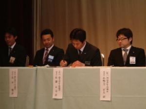 開催場所:ほほえみの宿 滝の湯 開催名称:「2008年度 社団法人 日本青年会議所 東北地区協議会 会員大会 東北青年フォーラムin天童 副主管契約締結式」 内容: 1.契約締結書朗読 2.契約締結式 (1)主管LOM(天童)を含む17LOMの理事長による署名・捺印。 (2)山形ブロック協議会、会長による署名・捺印 (3)東北地区協議会、会長による署名・捺印 <報告> 今年度9月に開催予定の東北地区協議会、会員大会 東北青年フォーラムin天童の副主管契約締結式が3月3日、天童で開催されました。 主管される天童青年会議所を含む山形県内、17青年会議所の理事長、山形ブロック協議会、会長、東北地区協議会、会長が集い、厳粛に署名捺印を行い、大会の成功を祈願しました。 ↑署名捺印後の集合写真です。 報告者:白井賢一郎 長井青年会議所公式ホームページ → http://nagai-jc.jp/ |