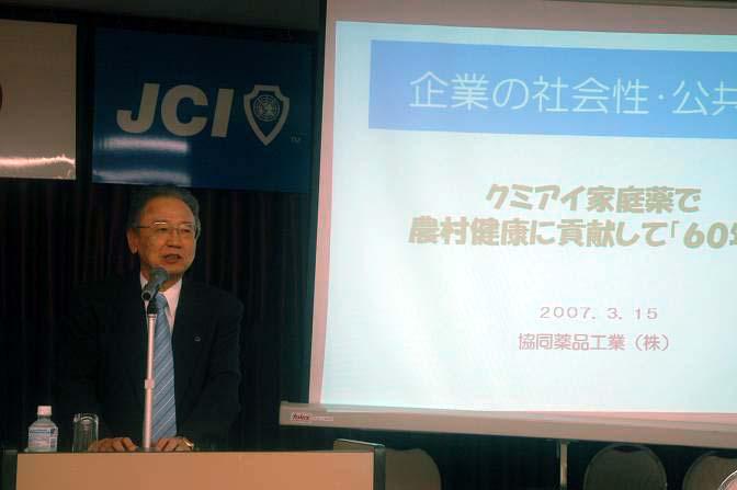 講師として、協同薬品工業(株)横澤寿彦代表取締役社長をお招きして講演を頂きました。演題を『企業の社会性について〜医薬品を通して農村の健康に貢献する〜』としまして、協同薬品工業様の歴史から始まり、CSR関連で実際に会社で取り組んでおられる事例について説明していただきました。また、近江商人の三方よしの精神や、松下電器と不二家の事例などもまじえてお話しいただき、総括的な内容となりました。