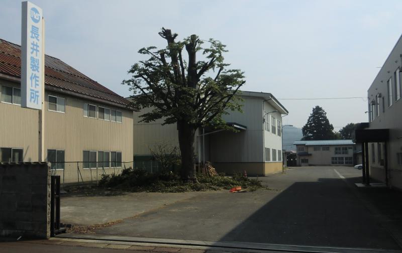 通常、こういう樹木は剪定作業などしないのでしょうが、区画整理により、建物が周囲に立ち並び、枝が建物の屋根にかかったり、大型トラックの通行にも支障が出てきましたので、剪定作業を業者さんにお願いしました。