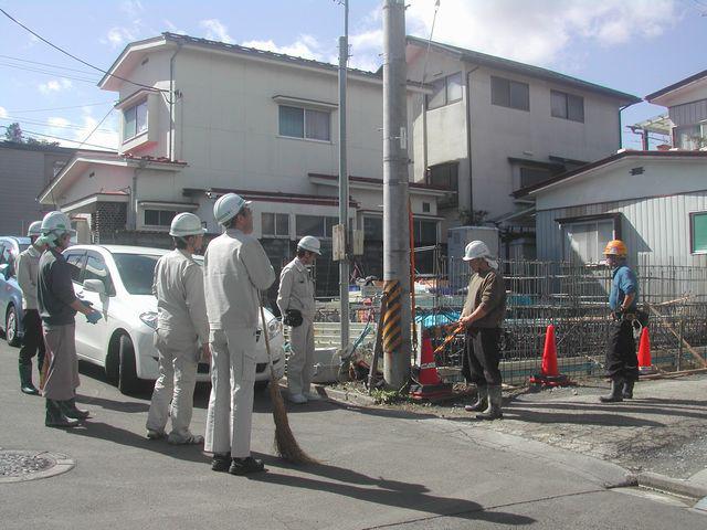 営業はもちろんの事、内勤者も作業服に着替え、約30分間、近隣の道路や敷地内を職人さんと一緒に清掃します。