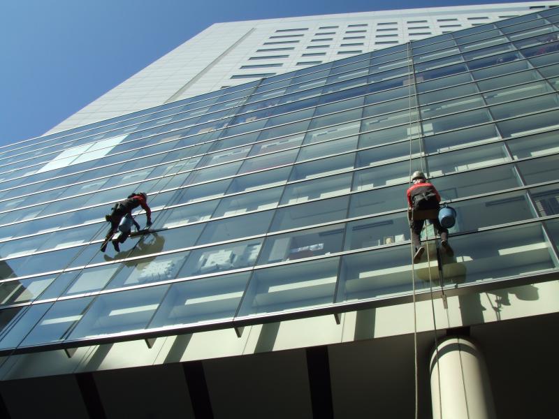 この垂直の壁面をロープ1本で降りてきて、ガラスを磨いていく。