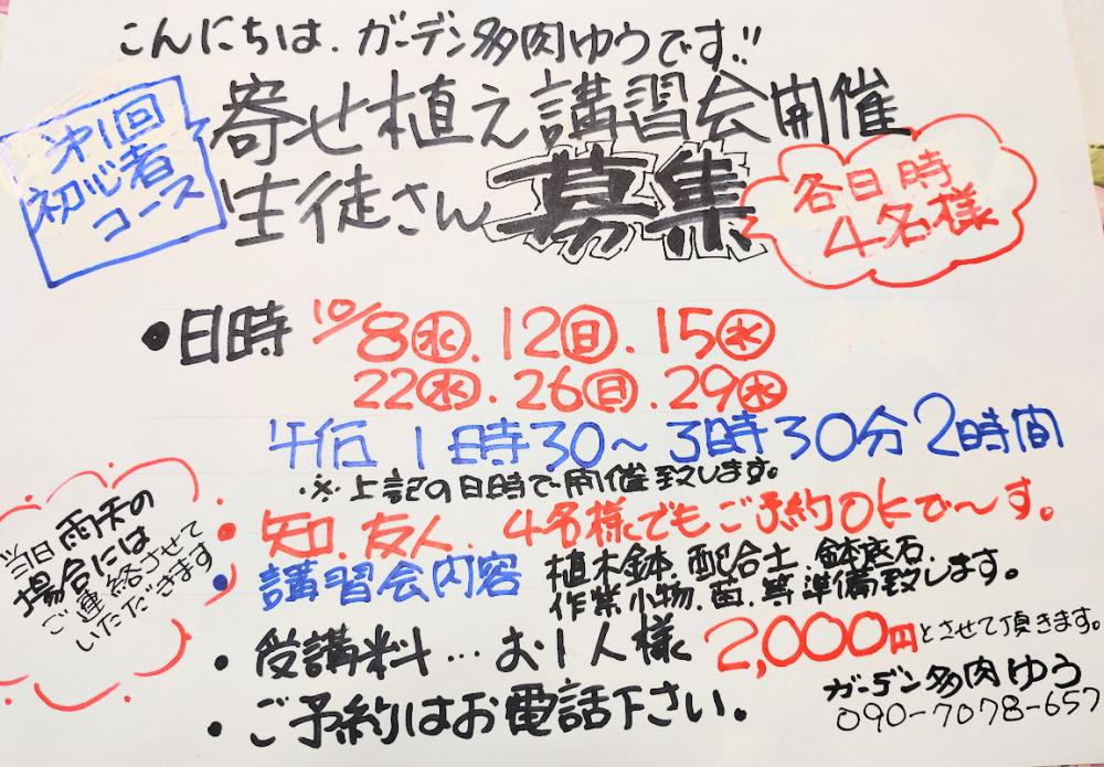 川樋の【ガーデン多肉ゆう】さんが、寄せ植え教室を開催するとのこと。