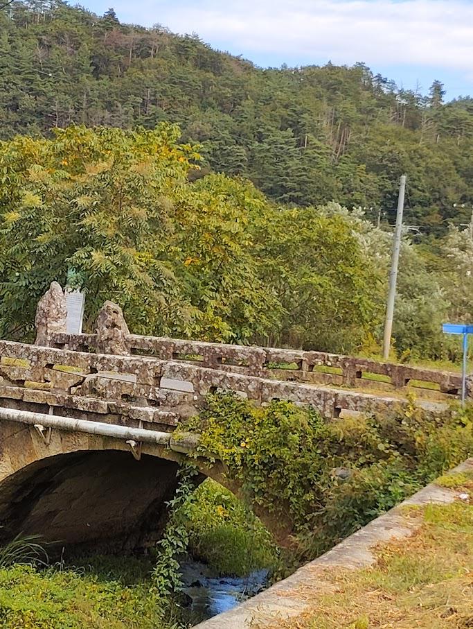 福昌寺の前を通って遠目に見える目を引くデザインの狛犬をチラ見して、静御前が義経を追う道すがら出産したという逸話を教えてもらい、11:30頃最終目的地である吉田橋に到着しました。