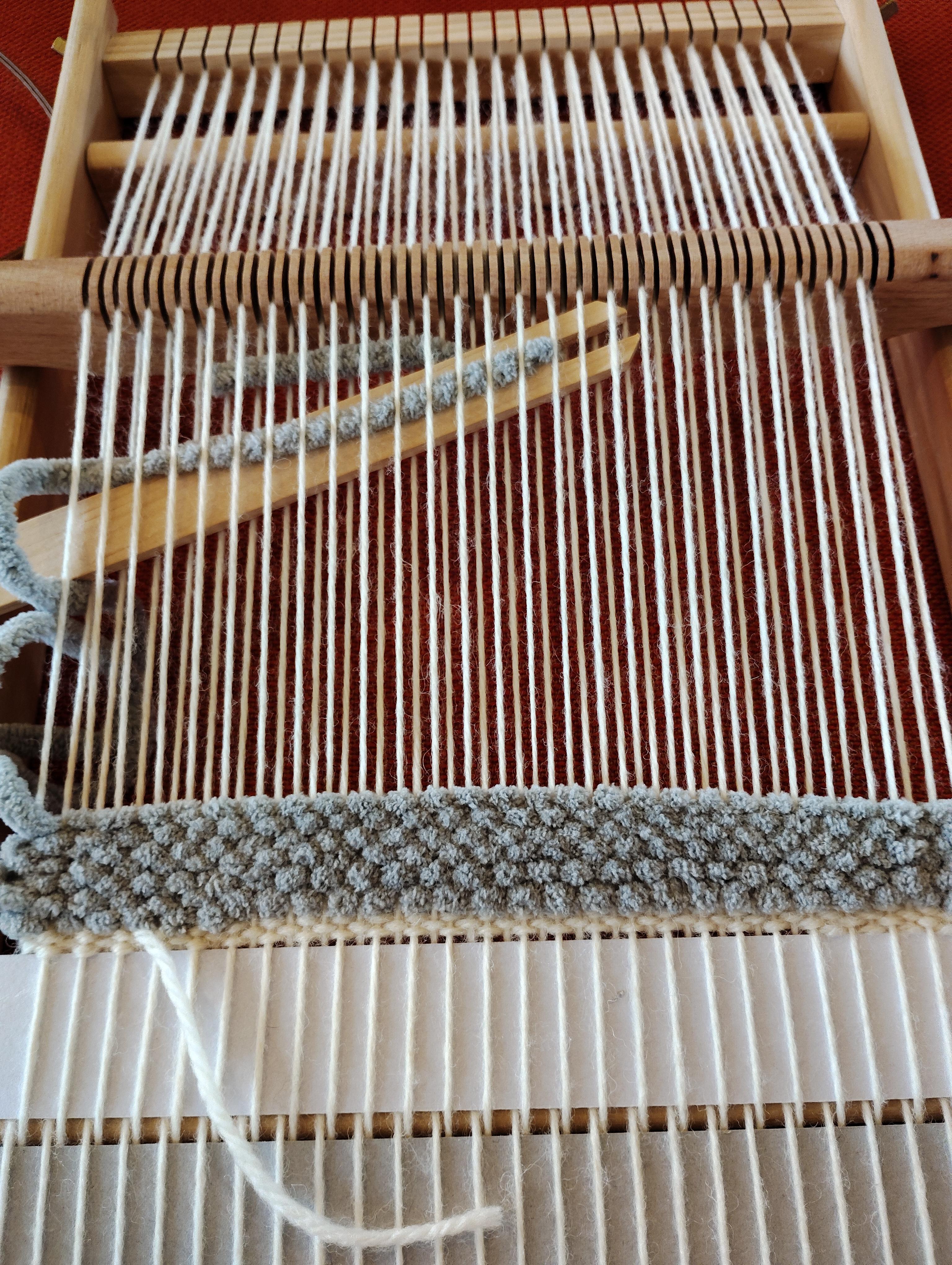 卓上機織りで横糸のかけ方を教わり、なんとかコースターを完成。二枚目は縦糸の張り方からご指導いただきました。