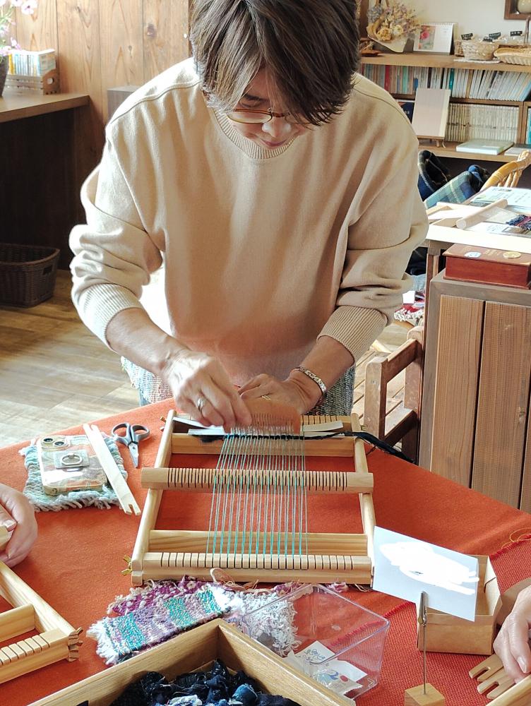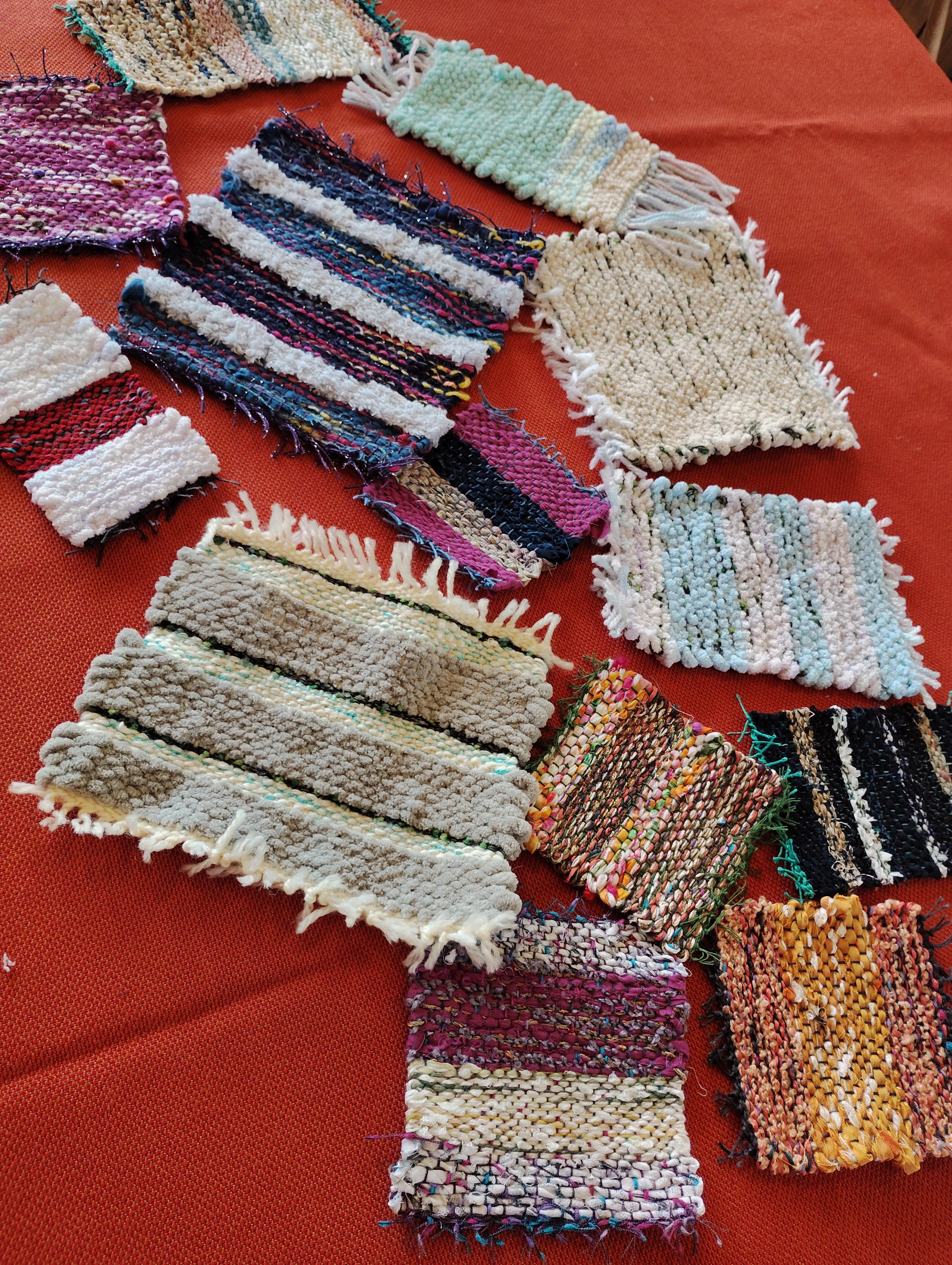 各自好きな糸や布でサイズも自由に作成ということで、今回も先生やご参加の皆様と楽しくおしゃべりしながら、夢中で織り進めて、コースターとミニ敷物を完成させました!