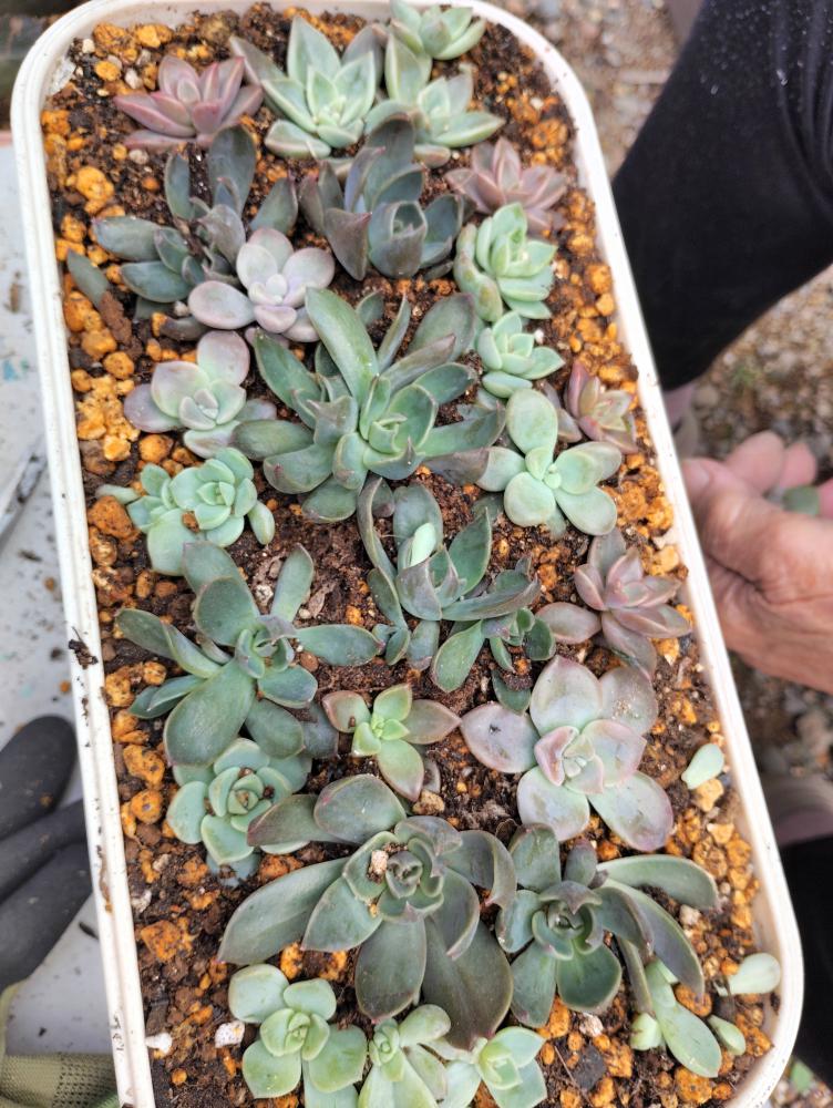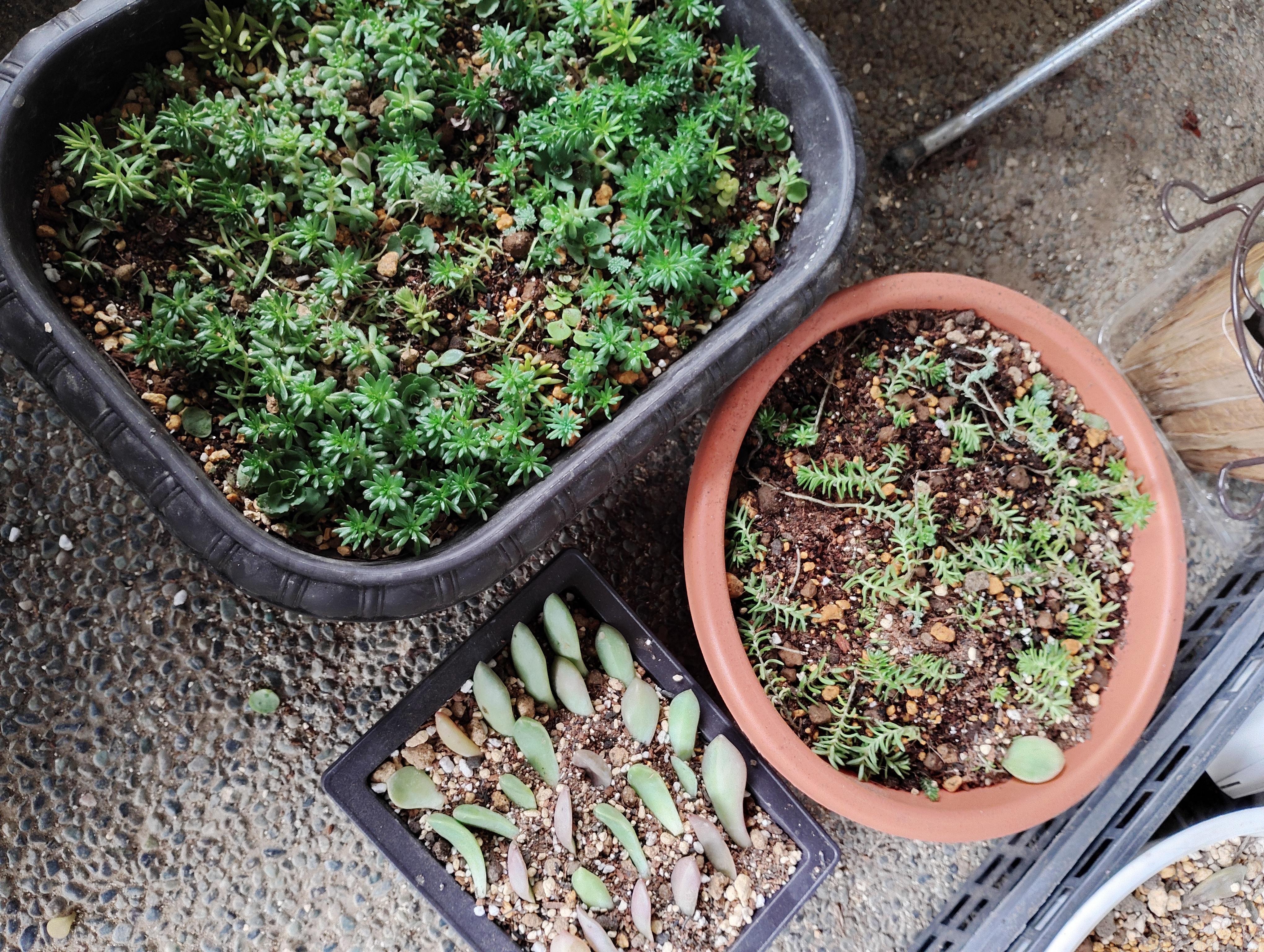 【ガーデン多肉ゆう】さんのご指導のもと、プランターから葉挿しの子苗を慎重に抜いて、色味や大きさのバランスを考えながら新しい鉢に配置して、次々と植え込んでいき、自宅で増やしているセダムで隙間を埋めて、可愛い寄せ植えができました\(^o^)/