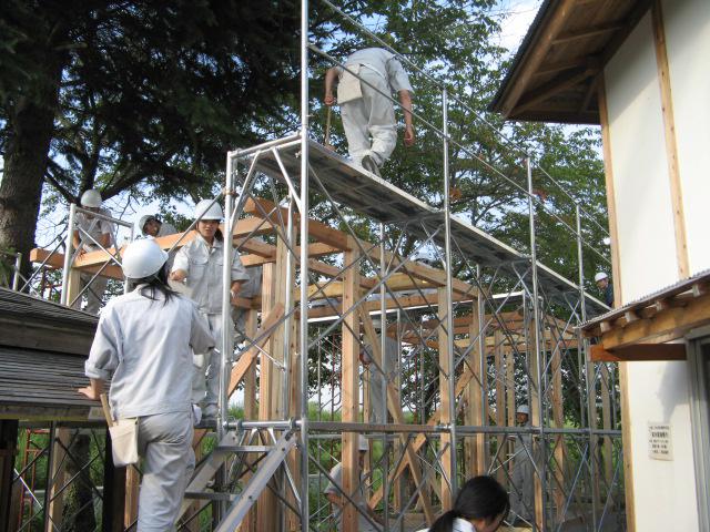今日はいよいよ建て方です。高くてこわいと言いながらも協力しながら1班、2班とも、組み上がりました。
