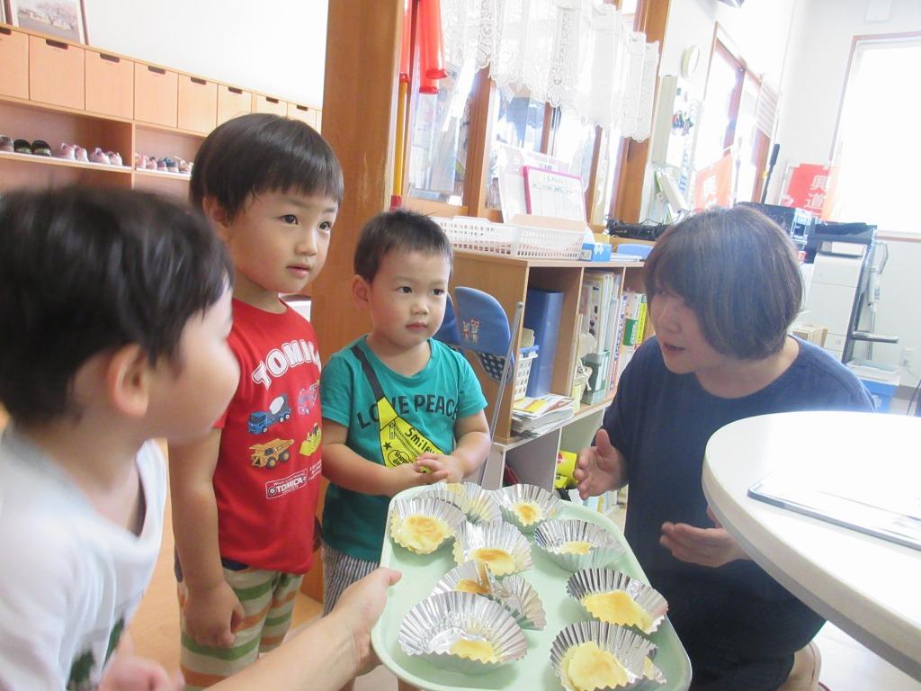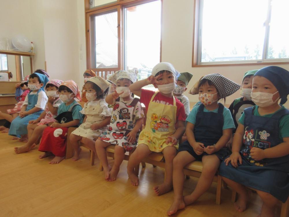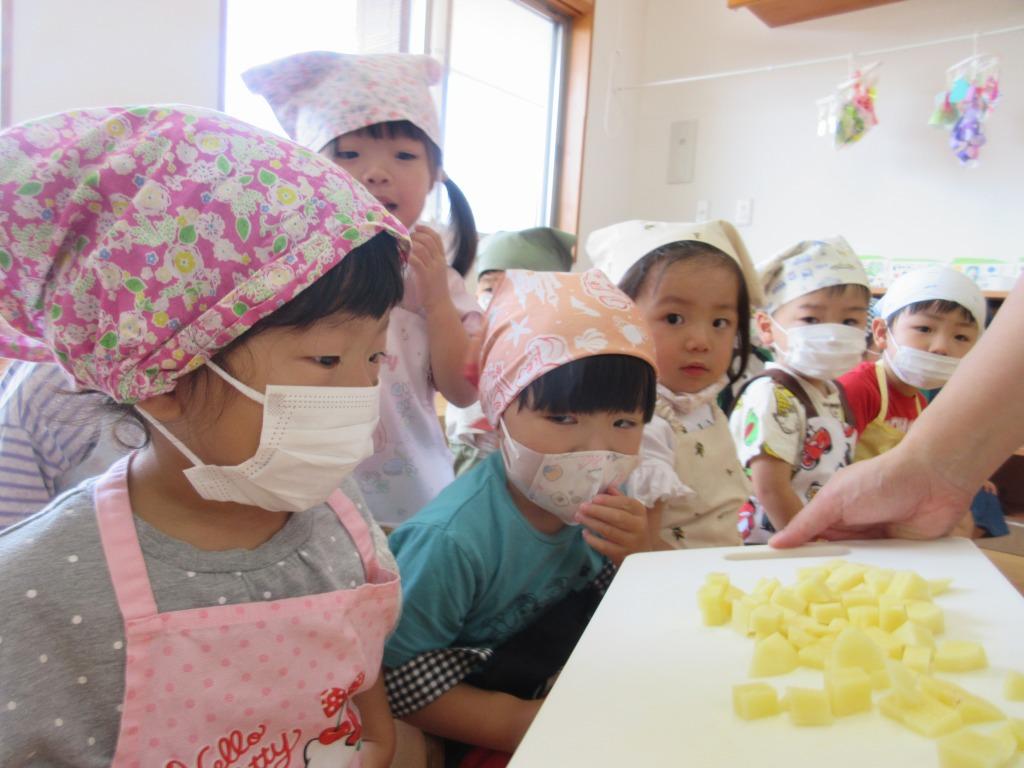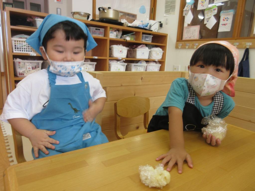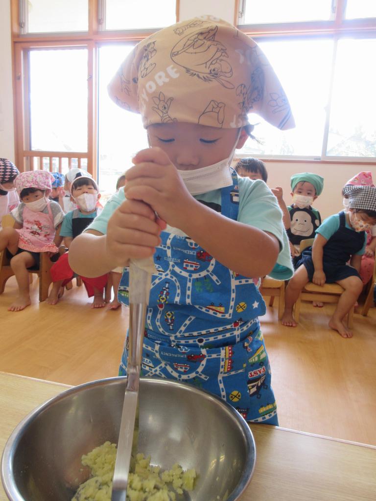 もも組の畑で大事に育てたじゃがいもを使って、クッキングをしました。エプロンを身に着けて張り切っている子どもたちの姿は、なんとも可愛らしかったです。作り方をよく聞き、じゃがいもをマッシャーで潰した後、ラップでじゃがいもを包みます。「いい匂い~」と、出来上がりを楽しみにしながら作っていました。美味しくできたじゃがもちを、他のクラスの友達や保育者にも振舞い、「美味しかったよ」の言葉に嬉しそうな子どもたちでした。
