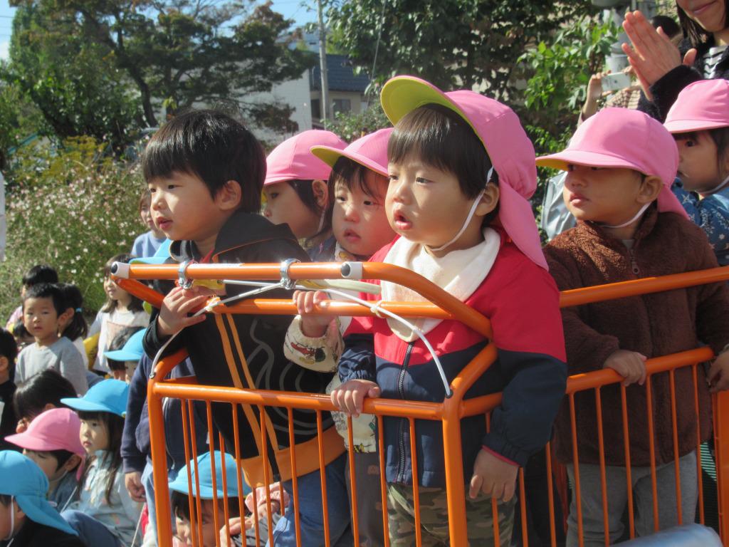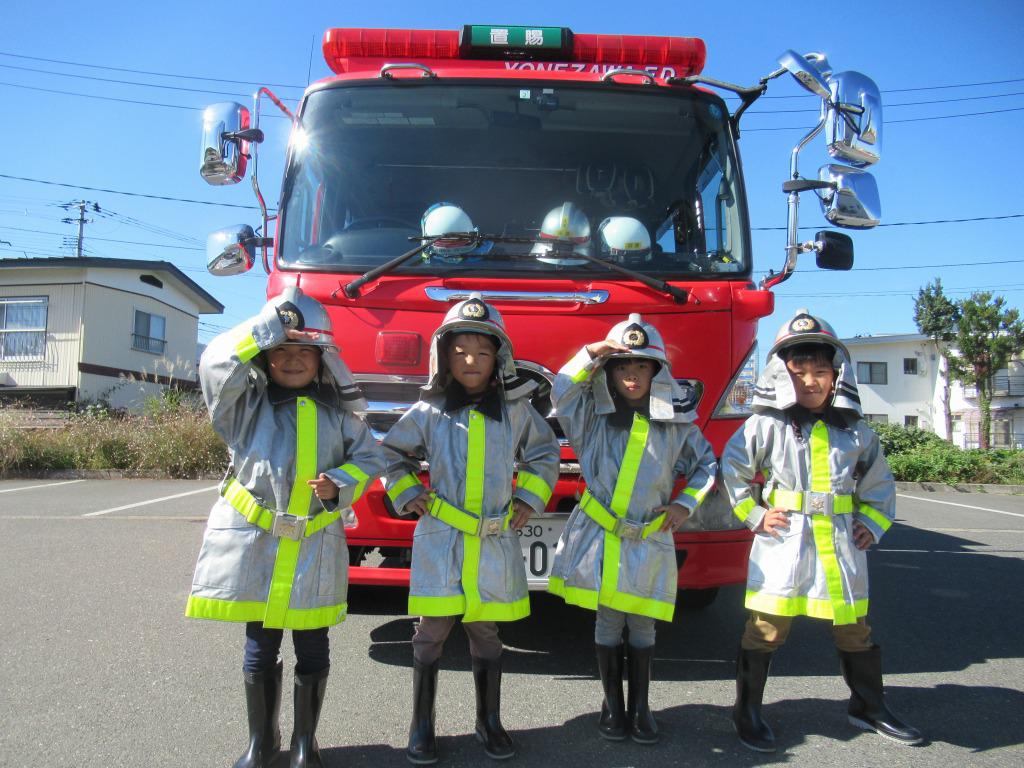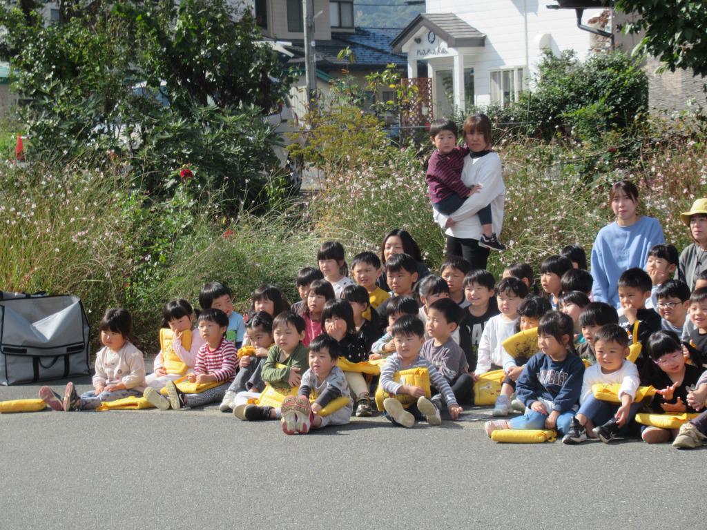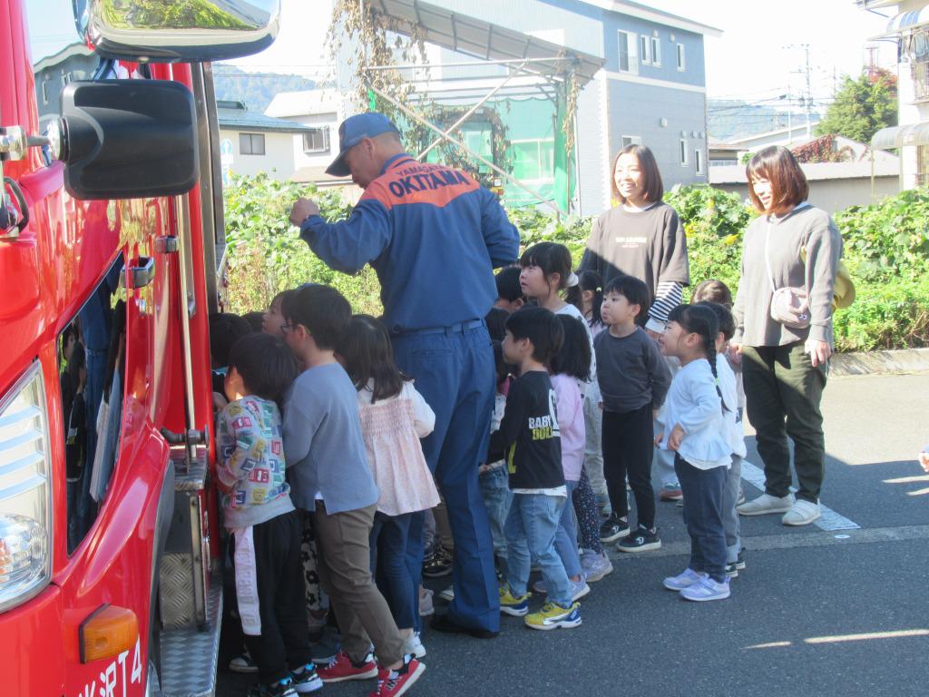 10月24日(金)防災訓練が行われました。火災の設定で第一避難場所(保護者駐車場)に避難しました。今回は消防士の方に避難する様子を見ていただきました。こどもたちは「お、は、し、も」の約束の話をお聞きし、その後消防自動車を見せていただきました。職員は水消火器を実際に使用して訓練を行いました。