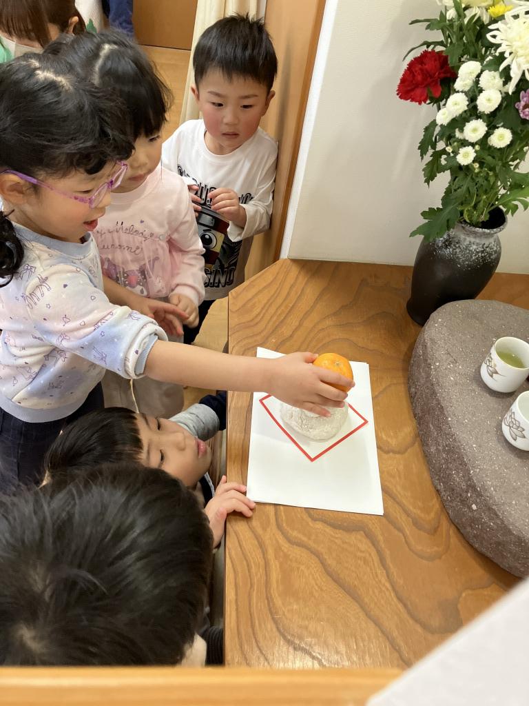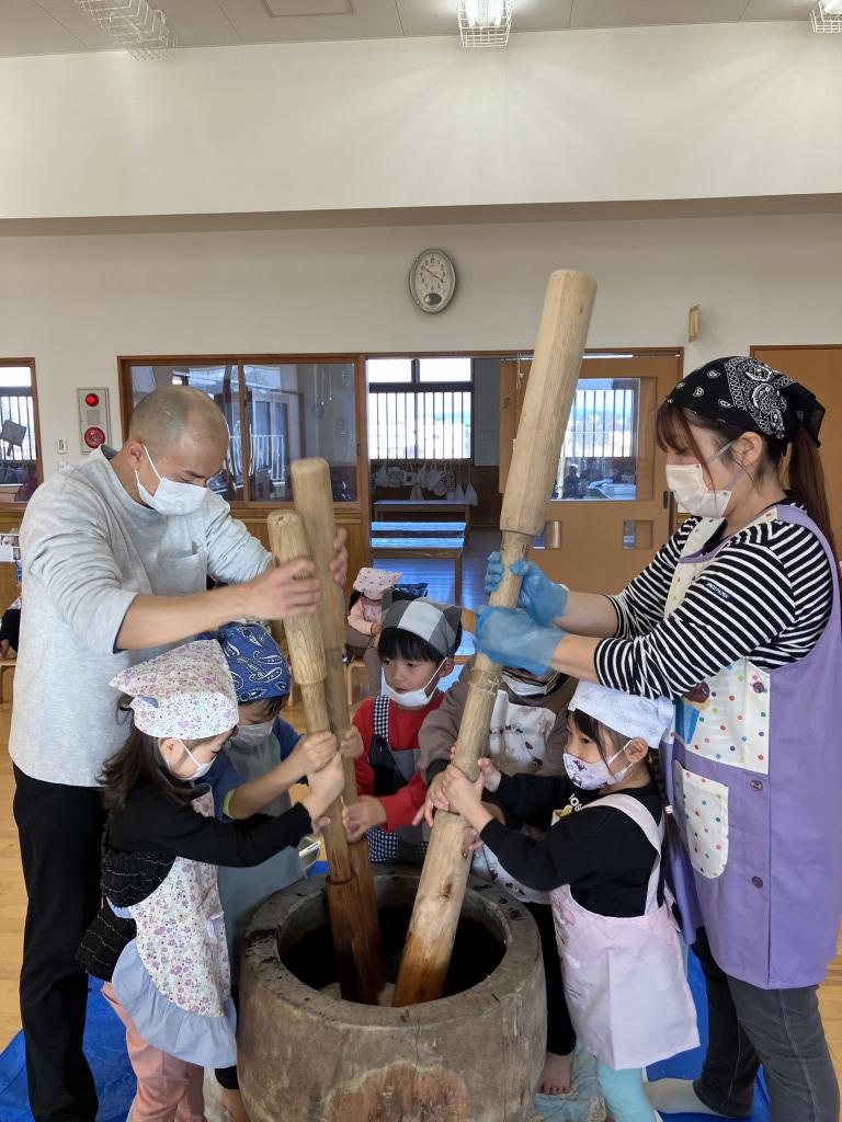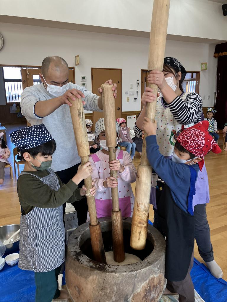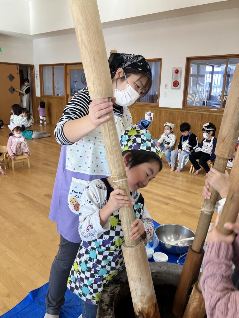 12月26日(金)餅つきが行われました。前日は年長児が米とぎを経験し、翌日の餅つきに期待をふくらませていました。遊戯室に集合し、もも組、幼児組は保育者と一緒に杵を持ち「ぺったん、ぺったん」と力を合わせてつきました。みんなで餅つきの歌を歌って応援する中、年長児の男の子は杵を1人で持ち顔を真っ赤にしながらつく姿は頼もしかったです。できたお餅で子どもたちが鏡餅を作りお釈迦様にお供えしました。