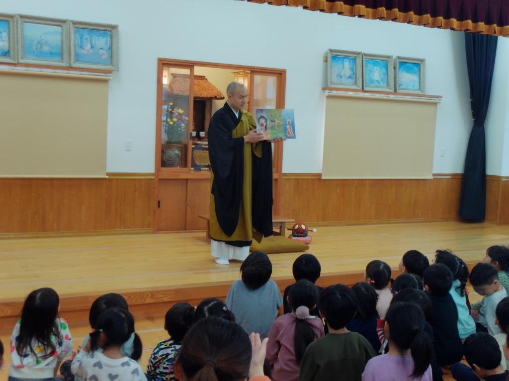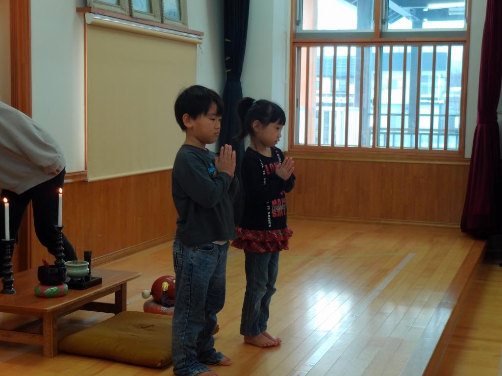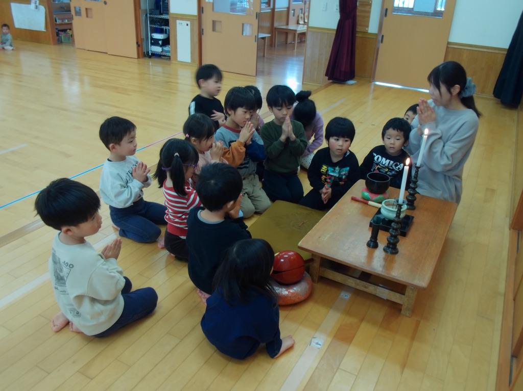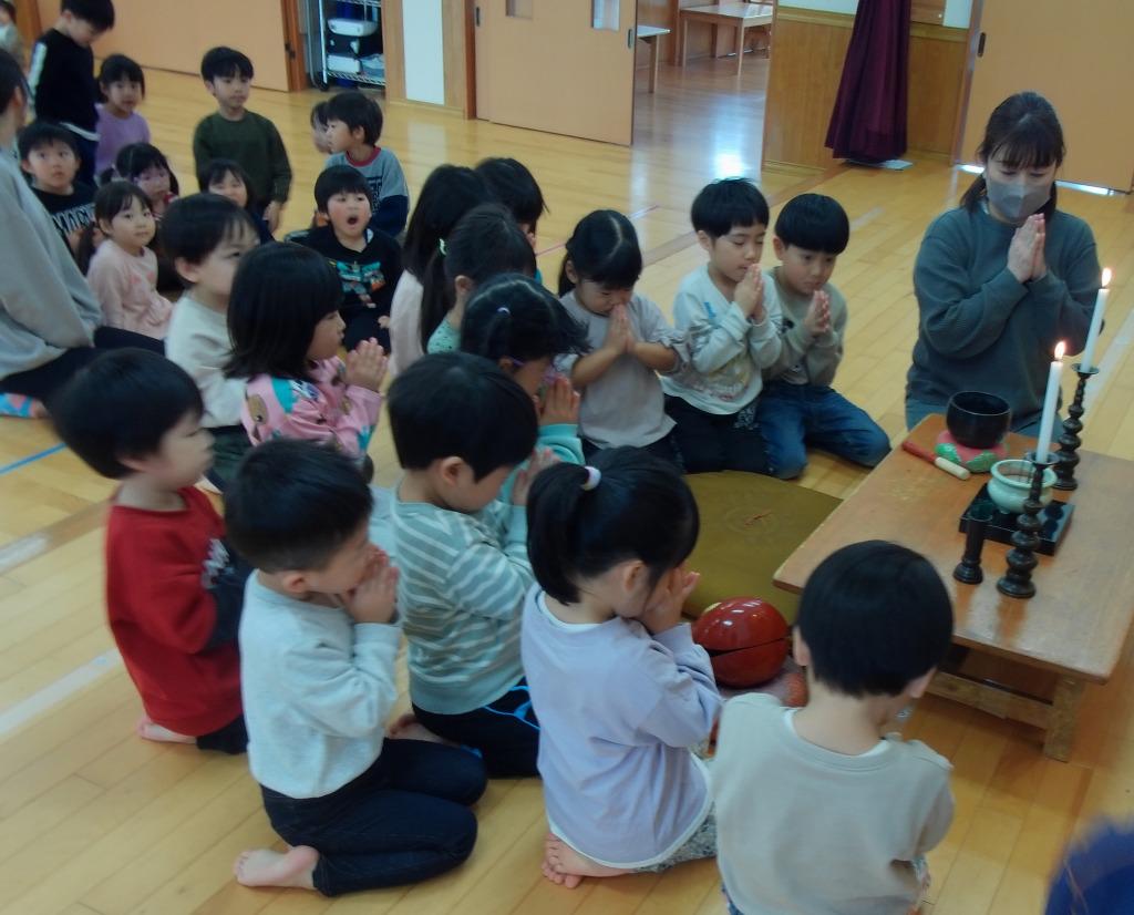 12月8日に、成道会が行われました。成道会は、お釈迦様がお悟りを開かれた日です。乗善寺の今成副住職様にお経をあげていただき、成道会のお話をお聞きしました。仏教行事ならではの雰囲気を感じ取っていた子どもたちです。おやつでは、御赤飯を味わいました。