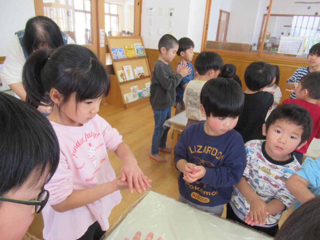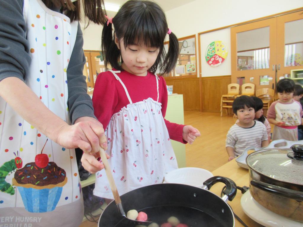 1月15日に、団子の木飾りを行いました。事前に折り紙を折って飾りを準備し、前日には年長児がミズキの芽を摘んでくれました。団子の木飾りの由来や飾りの意味などを伝えると、真剣に保育者の話に耳を傾けていた子どもたちです。当日は、異年齢グループで団子を作り、みんなで飾り付けをしました。みんなが元気にすくすく大きくなりますように。