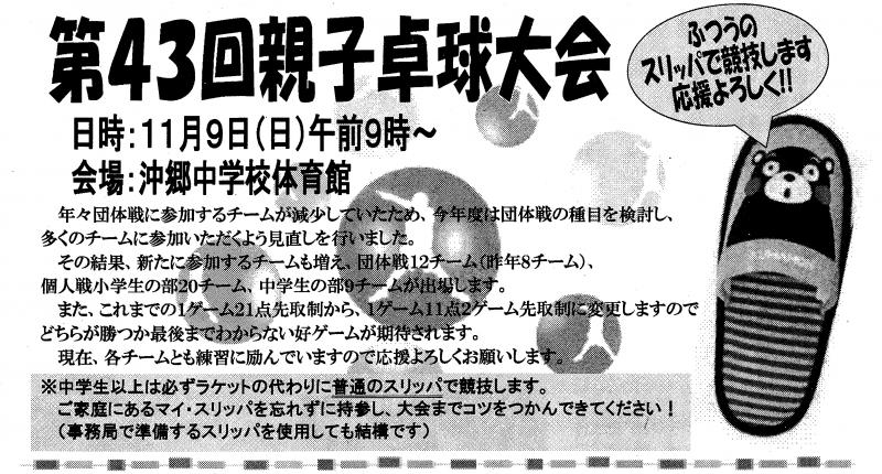 今年43回目となる親子卓球大会が開催されます。中学生以上は、普通のスリッパをラケットとして競技します。各チームとも練習に励んでいますので、大会当日の応援をお願いします。