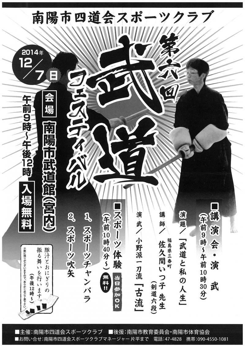 今回で6回目を迎える武道フェスティバルが今年も宮内の南陽市武道館を会場に開催されます。今回は福島の女性剣士佐久間いつ子先生をお招きし、武道講演が行われます。小野派一刀流演武、スポーツ(スポーツチャンバラ、スポーツ吹き矢)体験コーナー、豚汁とおにぎりの振る舞いもありますので、ぜひお越しください。