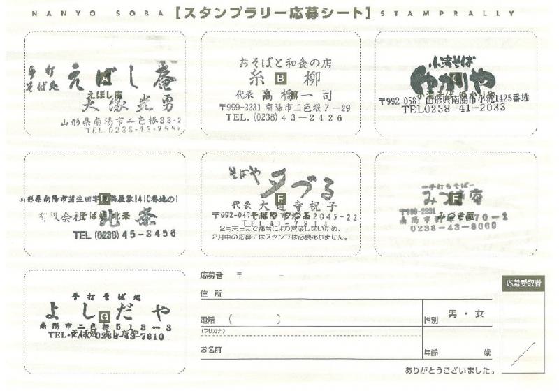 「南陽そばスタンプラリー」ついに"達成!"です。7ヶ所それぞれのお店で実際に食事をしましたが、どのお店も特色があり、また新たな"発見”の場になりました。全てのスタンプがそろったら、その応募シートでもって、加盟店7ヶ所のいずれかで、無料お食事(1,000円以下の一品)をすることが出来、その後お店に応募下さい。抽選で素敵な賞品が後日当たります。