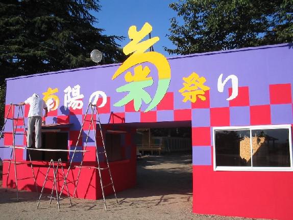 画像は9月28日現在の菊まつり会場入口で、業者さんが文字塗りをしている貴重な瞬間です。会場内の場面も公開したいのですが、それは実際にみなさんの目でご確認下さい。