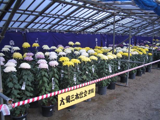 写真は24日(月)のものですが、会場全体があでやかな色に包まれています。30日の審査日に向けてどの花も「ラストスパート!」といったところでしょうか?尚、写真の「大菊三本仕立(厚物)」中から"内閣総理大臣賞"が選ばれますので、会場お立ち寄りの際は注意して見てください。