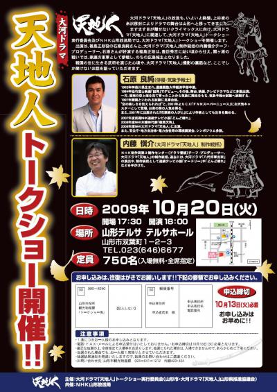 大河ドラマ「天地人」の放送もいよいよクライマックスを迎えます。上杉家の米沢移封によりドラマの舞台も米沢へと移って、ますます目が離せません。 今回の放送を記念して、大河ドラマ「天地人」トークショー実行委員会と、NHK山形放送局との共催によりトークショーを開催いたします。 トークショーでは、「福島正則」役を演じている石原良純さんと、NHK制作統括チーフプロデューサーの内藤愼介氏をお迎えし、戦国の世に生きる武将を演じた心境や、大河ドラマ「天地人」撮影の裏話など、ここでしか聞けないお話を語って頂きます。 ■大河ドラマ「天地人」トークショー ■日時:平成21年10月20日(火) 開場17:30 開演18:00 ■場所:山形テルサ「テルサホール」 山形市双葉町1−2−3 ■入場料:無料 ■定員:750名(全席指定) ◎お申込み方法 ▼往復はがきに「住所」「氏名」「電話番号」を記入の上お申込みください。(電話・FAX・メールによる申込みは受付けておりません) ▼1通につきお一人様の申込みとなります。抽選のうえ、全席指定で入場券をお送り致します。 ▼申込み締切日:10月13日(火)必着 ▼申込み先住所 〒990−8540 山形市役所観光物産課「トークショー係」 ▼お問い合わせ先:山形市観光物産課 TEL023−641−1212 内線423・424 |
