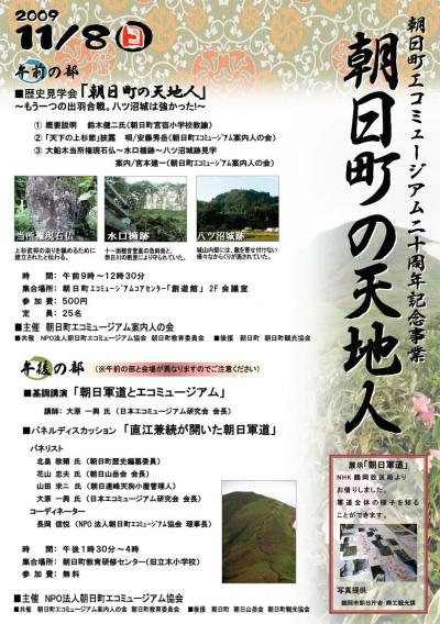 慶長5年(1600)の慶長出羽合戦の際、上杉軍の別働隊が最上川沿いに進軍し、朝日町の鳥屋ヶ森城や八ッ沼城で戦いとなりました。 午前の部では、上杉軍の進軍ルートや八ッ沼城の構造を考察する歴史見学会が開催されます。 午後の部では、直江兼続が開削した「朝日軍道」に関する基調講演とパネルディスカッションが開催されます。 どうぞお出かけください。 ■開催日:平成21年11月8日(日) 午前の部:歴史見学会「朝日町の天地人」 ▼時 間:午前9時〜午後12時30分 ▼集合場所:朝日町エコミュージアムセンター「創遊館」2階会議室 ▼参加費:500円 ▼定 員:25名 午後の部:基調講演「朝日軍道とエコミュージアム」 パネルディスカッション「直江兼続が開いた朝日軍道」 ▼時 間:午後1時30分〜午後4時 ▼集合場所:朝日町教育研修センター(旧立木小学校) ▼参加費:無料 ...もっと詳しく |