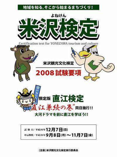 当日は、基本検定と直江検定の両方の受験も可能です。米沢市外の方の受験も大歓迎です。皆様のお申込みお待ちしております!! 試験日時 平成20年12月7日(日) 基本検定(通称:米沢検定) 午前10時〜 直江兼続の巻(通称:直江検定)午前11時30分〜 試験会場 米沢市すこやかセンター2階会議室ほか 受 験 料 基本検定(米沢検定)1,000円 直江兼続の巻(直江検定)500円 申込期間 平成20年9月8日(月)〜11月7日(金)まで 詳しくは米沢商工会議所HPをご覧ください。 |
