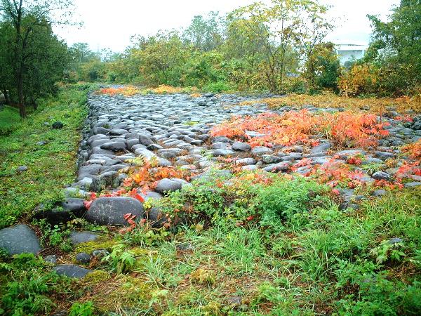 雨に濡れて黒く輝く石堤上部。