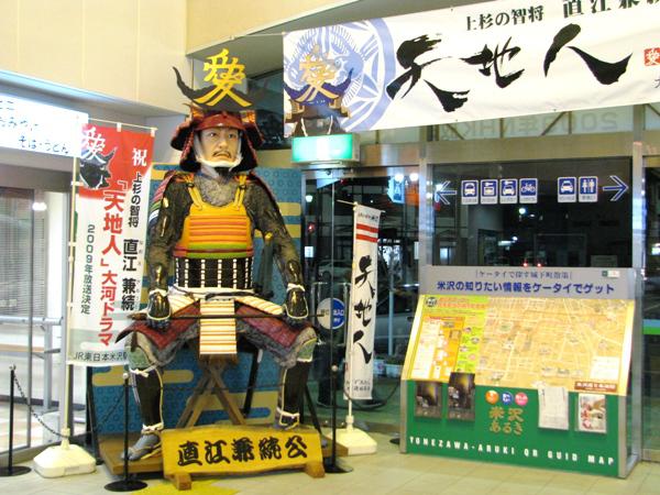 米沢直江会で製作した「直江兼続公」の山車人形がJR米沢駅に展示されています。全高約4mもある大きな直江兼続公が米沢の玄関口で皆様のお越しをお待ちしております。