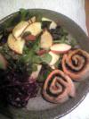 おつとめ品のレッドキャベツ(別におつとめしてなくてもよい…。)を千切りにして塩、こしょう、バルサミコでマリネします。 このお料理はフランスではよく出てきます。おそらくアルザス料理だと思います。ドイツのザワークラフトに似てますよね。 パイ生地にハーブとスモークサーモンを巻いて、輪切りにしてオーブンで焼いたもの。 パイ生地はバターだと混ぜるのが大変なので、私はいつもお菓子用のマーガリンを使っています。 しかも粉は計量なし…。薄力粉1カップ。強力粉半カップ。バター100グラム(その中から鉄板に塗る)。水1/3カップ。 フォークでバターをグサグサ切りながら混ぜ、水を加え、大きく切ったサランラップと濡れふきんで包み、冷蔵庫で30分寝かせます。 もう一枚サランラップを切って、生地を二枚のラップで挟み、麺棒でのばし(テーブルを汚さずにできるから。)、縦三つ折り、横三つ折りにしてのばして生地完成! 働く女性は忙しいから、だんだん効率的な方法が確立されていくわけで。きっと「最近の若い人はまぁー」って驚かれるのでしょうね。 |