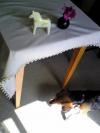 白布に白糸で刺繍をさしていったり、白に白を合わせるというものらしいです。 プロバンスだと、きなりにきなりを合わせたりしますが、白に白は北欧ならではなのではないかと思います。 初めて知った時は、目立たない作業だなぁと思いましたが、いざ試しに自分で作って(売っていないから作るしかない)使ってみて、心地よさに驚いたものです。 時間がないとなかなか味わう事のできない体験ですが。 写真は私の夜な夜な作品2です。 カーテンの残り布に、最近覚えたレース編をくっつけてテーブルクロスを作ってみました。 どうせ作るなら、プロバンス風にステッチでも入れようか…とも思いましたが、なんとなく北欧のダーラヘスト(写真の馬)を見ていたら、白に白でシンプルにいこうと思いつきました。 レース部分に、アイルランドのモチーフでもある三ツ葉がたくさんくっついていて気に入っています。 |