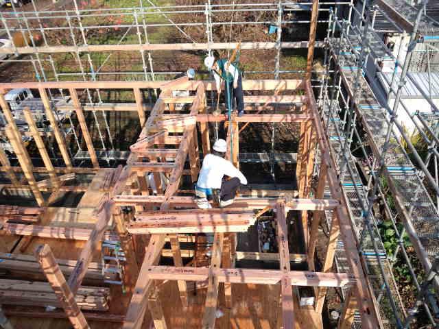 クレーンで木材を吊りながら、こうやって大工さんが組んでいくんですよ。