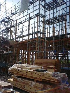 事前に足場を組んでおき、クレーンを使って建て始めます。