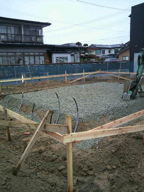 ベタ基礎の床堀・砕石を入れ、給水の逃げ配管をおこなった所です。