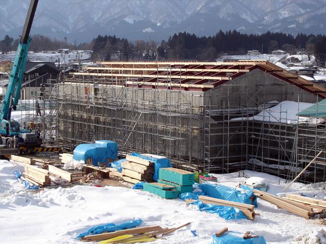 ギャラリーゾーンでは、躯体工事および屋根の鉄骨や木造軸組工事も3月上旬で完了しました。