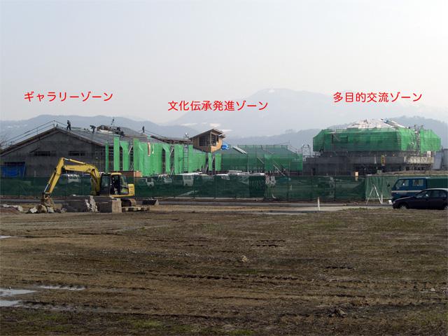 文化伝承発進ゾーンは1月下旬から木造軸組工事を開始し、3月中旬でほぼ完了しています。