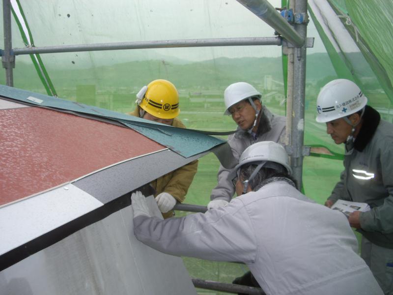 当工事の設計・監理をされている本間利雄設計事務所の設計室主幹 石田部長(中央手前)とホールの音響設計協力をされている永田音響設計 池田社長(中央奥)がホールの施工確認に来られました。