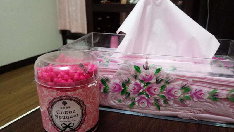 毎晩私のポイントを癒すモノは テーブルの上に乗っている【花束綿棒】と、【エリエールのピンクテッシュ】(*^-^*)