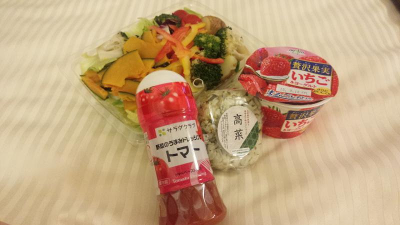 お昼は、インドカレーと大ぶりナンを食べたし、雨で嫌になったし、部屋にて夕食…