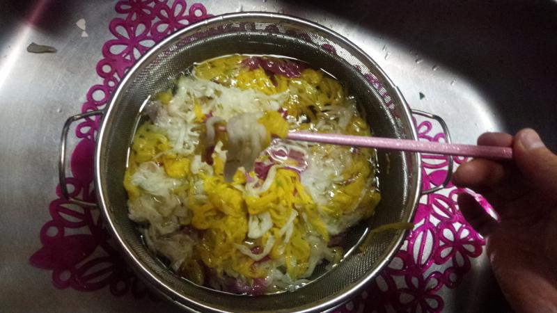 ザルの中で、泳ぐのは 大きな大きな 観賞用の菊です。