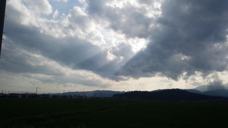 雲の隙間から光の階段が降りてくるような空に、たまに