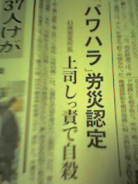 【「パワハラ」労災認定/43歳営業所長 上司しっ責で自殺】 ■東証1部上場の道路工事会社「前田道路」(本社・東京)の愛媛県内の営業所長だった 男性(当時43歳)が昨年9月に自殺したのは、上司からしっ責され続け、心理的な圧迫 を受けたことが原因などとして、新居浜労働基準監督署は労災と認定し、27日、妻の 岩崎洋子さん(43)(松山市)に通知した。弁護団は「パワーハラスメント(職権による 人権侵害)が原因と認められた異例のケース」としている。 ▲パワハラも労災になるんですね。まあ確かに業務の遂行性と起因性がないわけでは ありませんしね。 ━━━━━━━━━━━━━━━━━━━━━ +++『社会保障ニュース』編集室+++本部 http://plaza.rakuten.co.jp/socialsecurity/ ※リンク生成されない場合はアドレスバーに コピペしてください。 ━━━━━━━━━━━━━━━━━━━━━  |