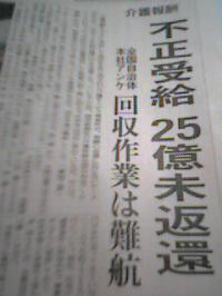【介護報酬不正受給25億未返還/全国自治体本社アンケ 回収作業は難航】 ■介護報酬を不正に受給して指定を取り消された介護サービス事業所が、報酬の返還 に応じないケースが目立ち、少なくとも約25億円が未返還となっていることが、読売 新聞社の介護保険全国自治体アンケートでわかった。市町村が返還請求した総額の約 7割にあたる。自治体は回収に努めているが、中には、破産したり、経営者が行方不 明となっている事業所もあり、回収作業は難航している。 ▲今度の介護保険制度の改革の一つに、介護報酬の不正受給防止が含まれていました が、それがこれから有効に機能してくるのかが気になります。 ━━━━━━━━━━━━━━━━━━━━━ +++『社会保障ニュース』編集室+++本部 http://plaza.rakuten.co.jp/socialsecurity/ ※リンク生成されない場合はアドレスバーに コピペしてください。 ━━━━━━━━━━━━━━━━━━━━━  |