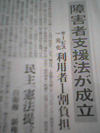 【障害者支援法が成立/サービス一元化利用者1割負担】 ■障害者福祉制度の再編や、原則1割の自己負担の導入などを柱とする障害者自立支援 法が31日、衆院本会議で、自民、公明両党の賛成多数で可決、成立した。 ▲障害者福祉政策を施設での保護から在宅での自立生活を支援するというのが法の趣 旨ですが、サービス一元化と利用者一割負担に対し、障害者団体から激しい反発を招 いています。地域社会での自立と利用者負担が両立するには、障害者の就労と所得保 障が不可欠だと思います。そのためにも障害者雇用促進法などの改正が必要だと思い ます。 ━━━━━━━━━━━━━━━━━━━━━ +++『社会保障ニュース』編集室+++本部 http://plaza.rakuten.co.jp/socialsecurity/ ※リンク生成されない場合はアドレスバーに コピペしてください。 ━━━━━━━━━━━━━━━━━━━━━  |